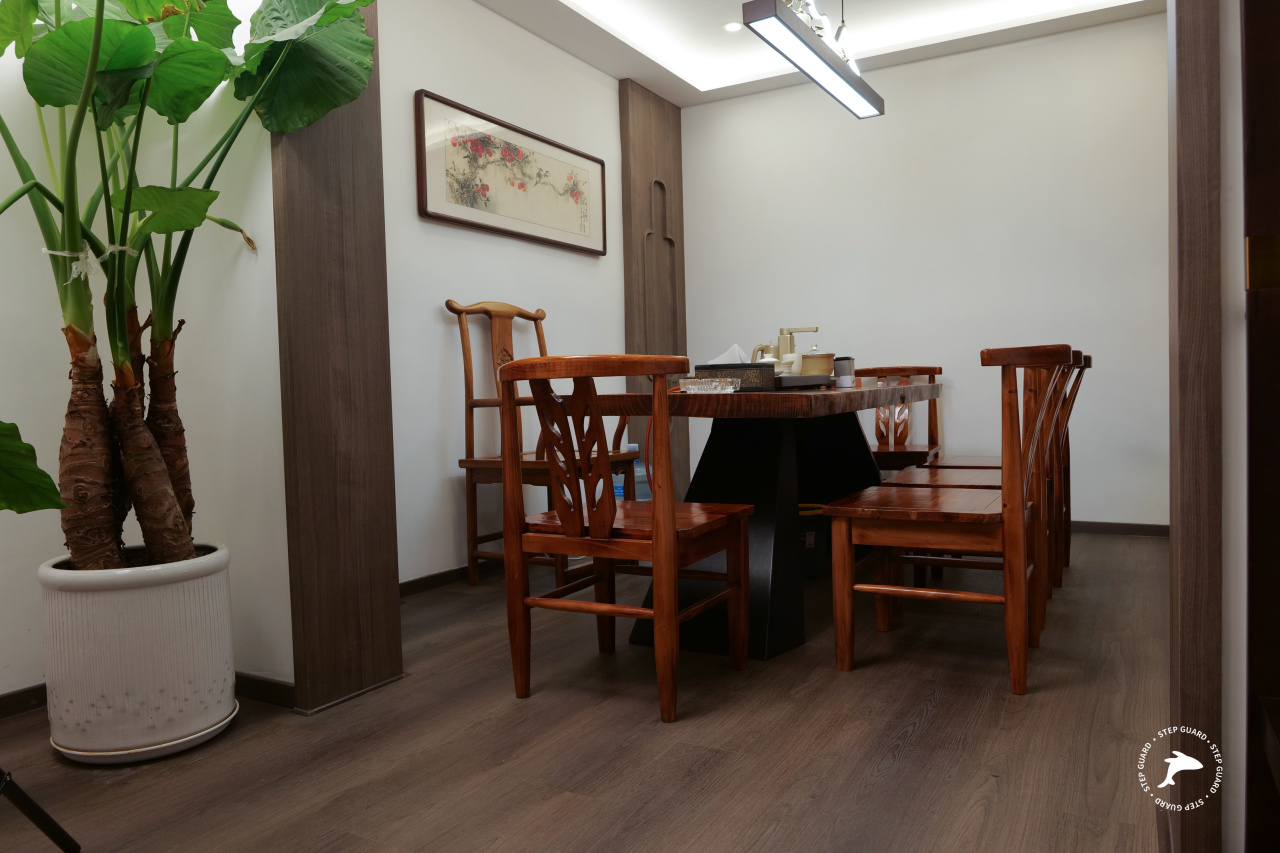 「叁舍」从不担忧日常卫生的维持清洁,WD912表层UV抗油污易清洁的性能让地面空间更好打理,每场接待过后轻松恢复整洁地板。
