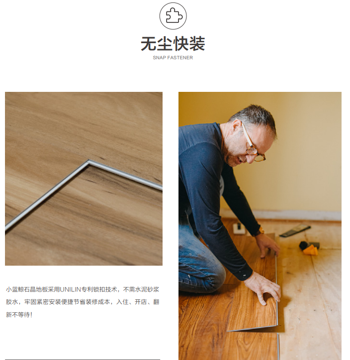 小蓝鲸石晶地板使用的是锁扣式安装,铺装之后立即可以使用,一个工人一天可铺装大概100多平方,并且用不到水泥砂浆这些辅料,整体安装并不需要复杂的工具,锁扣式安装非常简单便捷。