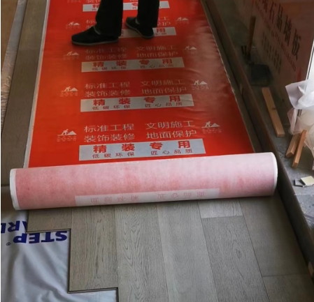 小蓝鲸石晶地板铺装完之后上面再铺一层?;つ?,防止装修油漆和剐蹭